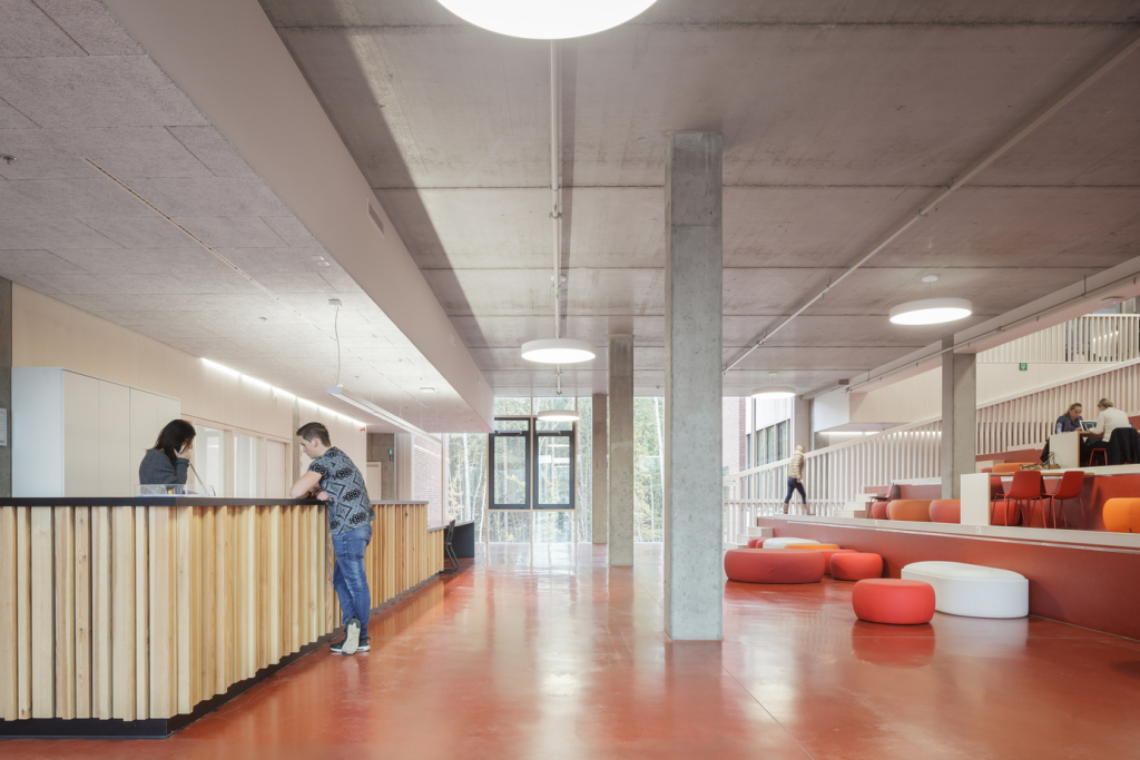 De gemeenschappelijke studeerruimte is ontworpen als een levendige ontmoetingsplek, waar de opvallende tinten rood en oranje direct in het oog springen. Deze kenmerkende uitstraling is consistent doorheen de hele campus, waardoor een samenhangende en dynamische leeromgeving wordt gecreëerd.